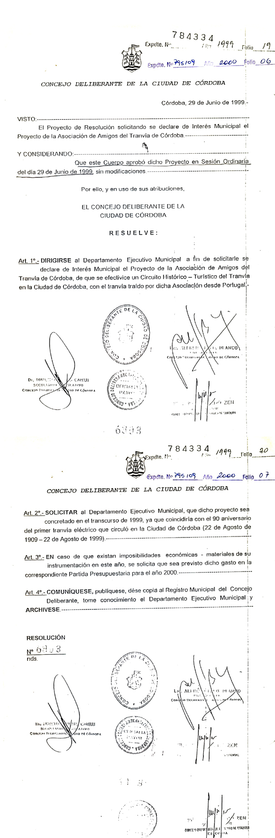 El 25 de Abril del 2001, el señor Intendente Municipal de Córdoba, doctor Germán Kammerath le dio definitivo apoyo político a la vuelta del tranvía al promulgar (ver Decreto) la Ordenanza que fuera aprobada por el Concejo Deliberante a principios de ese año. Las obras comenzarían en breve, y los costos que demande la construcción del circuito serían a cargo de la comuna cordobesa, financiados a través de firmas patrocinadoras.
