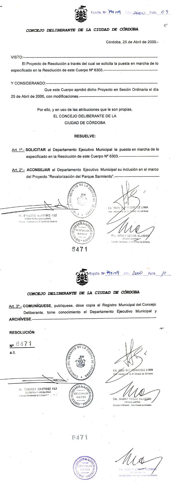 El proyecto en cuestión ha tomado estado parlamentario en el Concejo Deliberante de la Ciudad de Córdoba, habiendo sido aprobado por Res. 6303/99 y actualizado por las nuevas autoridades mediante Res. 6471/00 de fecha 25 de abril de 2000, solicitando a la Intendencia Municipal su inserción en el Plan de “Revalorización Turística” del parque Sarmiento que se encuentra en plena ejecución.